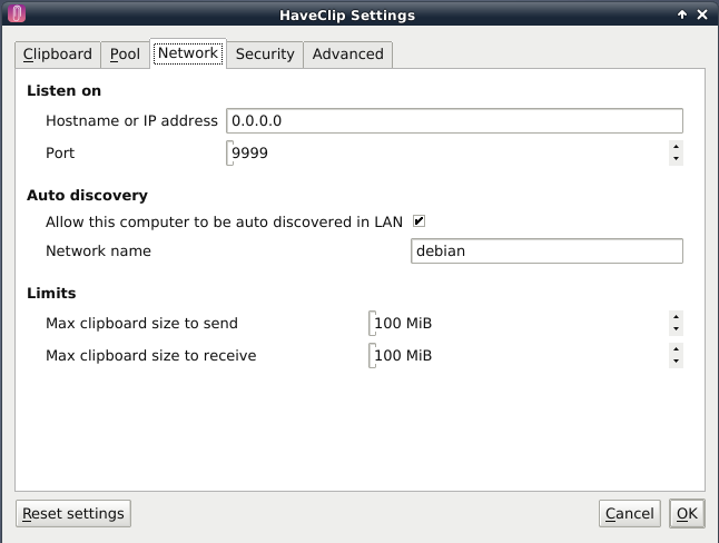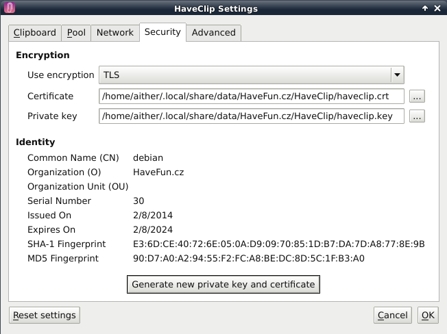 If not configured otherwise, TLS is used for sending all data over network. Every HaveClip instance is identified by a self-signed certificate. The pairing process verifies certificates on both sides and remembers them. HaveClip ensures, that the clipboard will be sent and received only to/from authenticated peers (those listed in Devices with appropriate certificates).